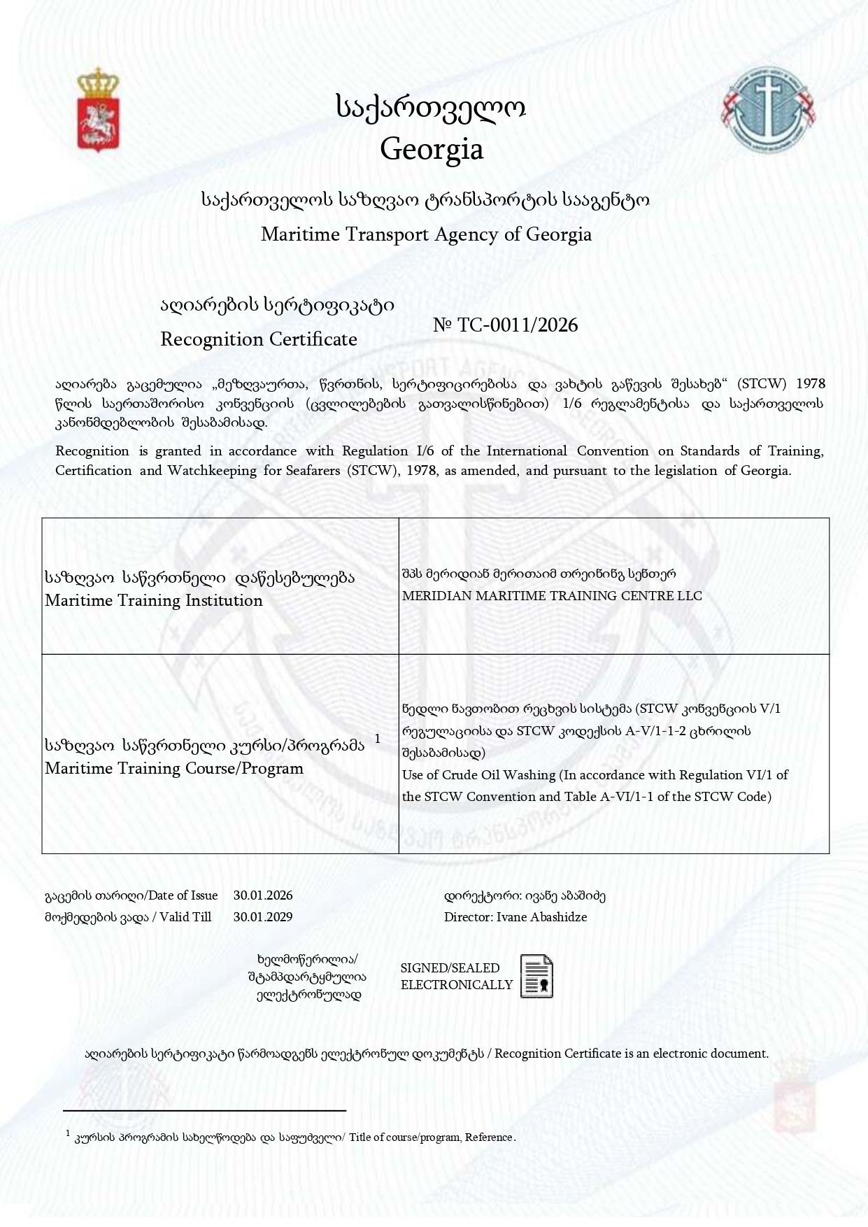 • „ნავთობმზიდი, ქიმმზიდი და თხევადი აირების ტანკერის სატვირთო ოპერაციების გაცნობითი წვრთნები“ STCW კოდის A-V/1 გვ. 2-7 31.12.2011 სტანდარტული მოთხოვნების შესაბამისად.