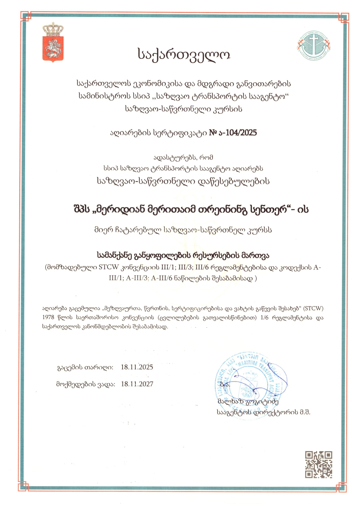 - კომპეტენციის სერტიფიკატი STCW კონვენციის II/1, II/2 ან II/3 მოთხოვნებთან შესაბამისობაში;