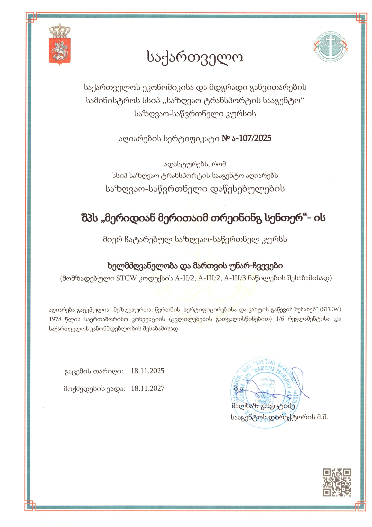 - კომპეტენციის სერტიფიკატი STCW კონვენციის II/1, II/2 ან II/3